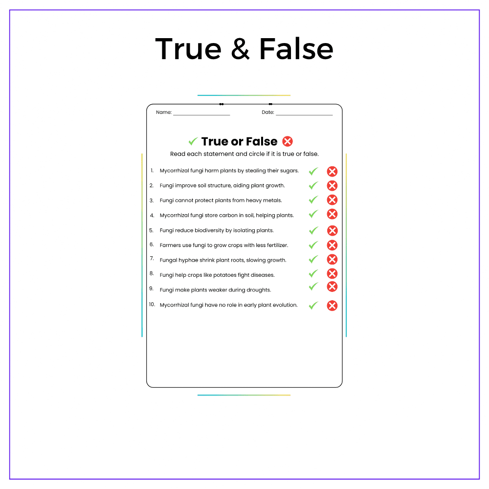 ✅ True & False exercises – Test students’ knowledge of fungi’s role in plant survival