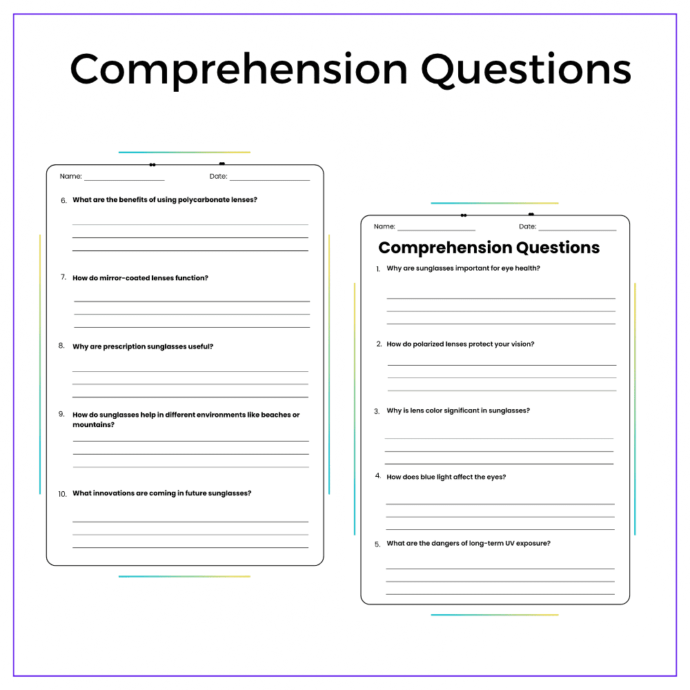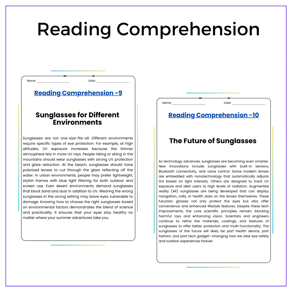 - Comprehension passages – Explore light, UV rays, and lens technology