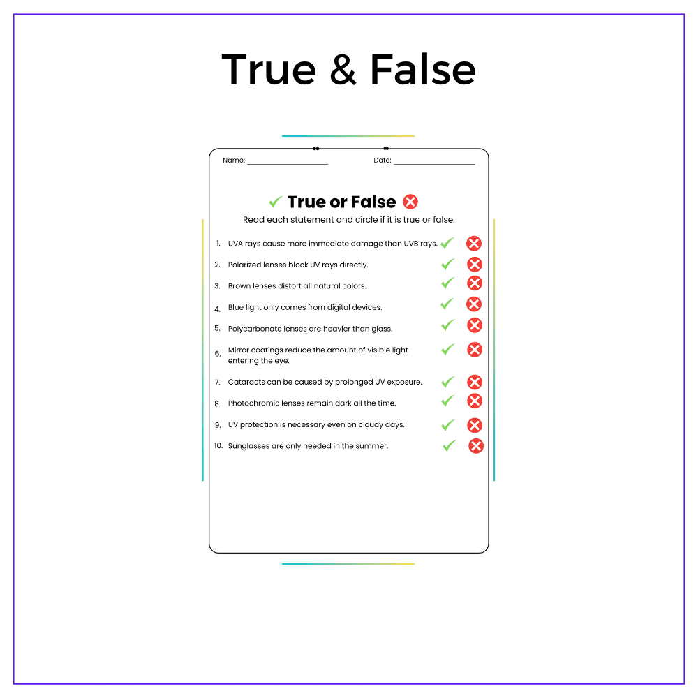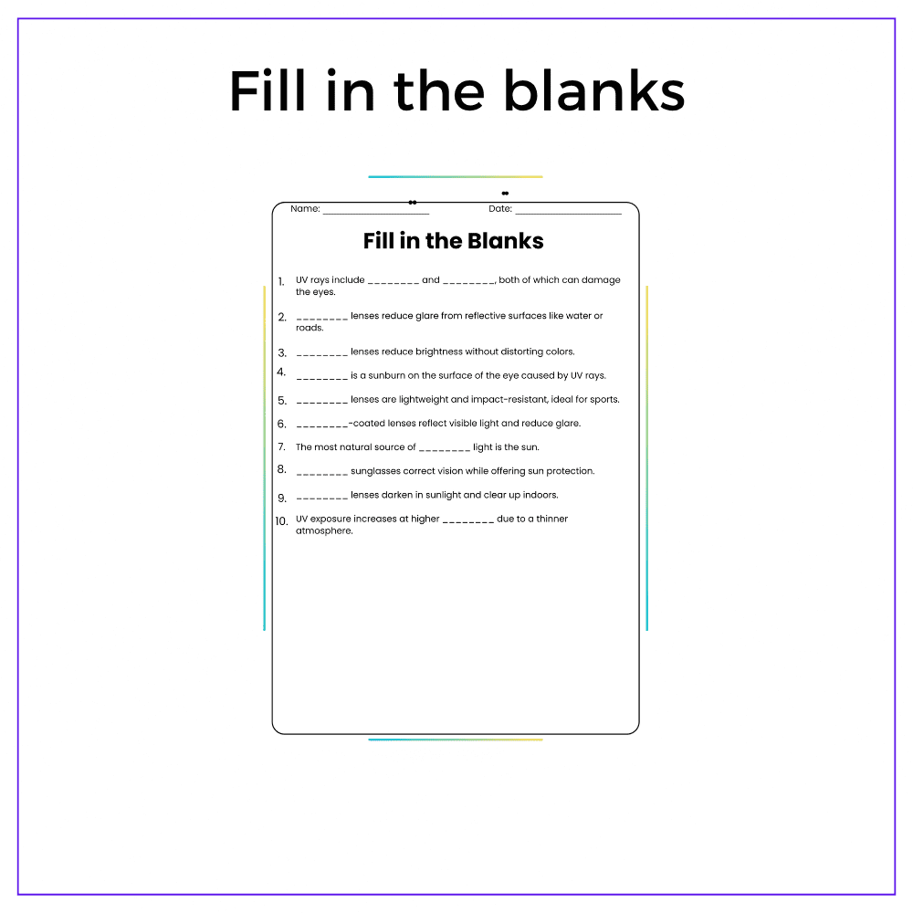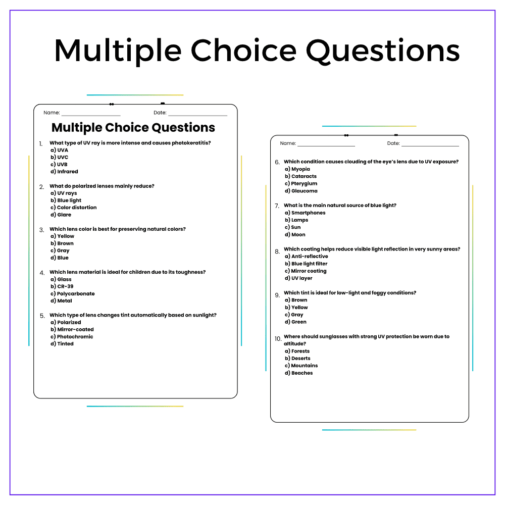 This worksheet helps your students explore eye safety with this interactive Science of Sunglasses worksheet! Designed for grades 4–8, this resource dives into how sunglasses block harmful UV rays, reduce glare, and protect our eyes from sun damage, making optical science both fun and practical.