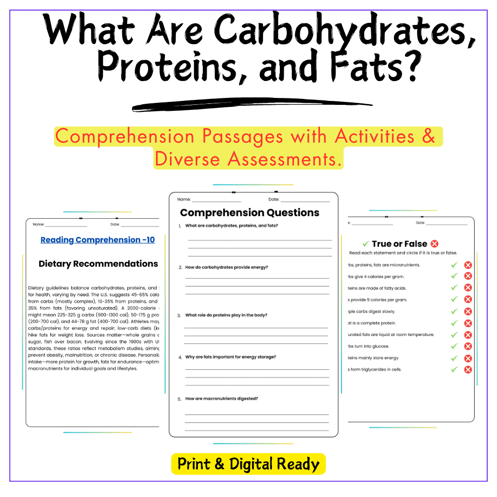 Help your students decode nutrition with this What Are Carbohydrates, Proteins, and Fats? worksheet! Designed for grades 4–8, this resource explains the structure, function, and sources of the three major macronutrients.