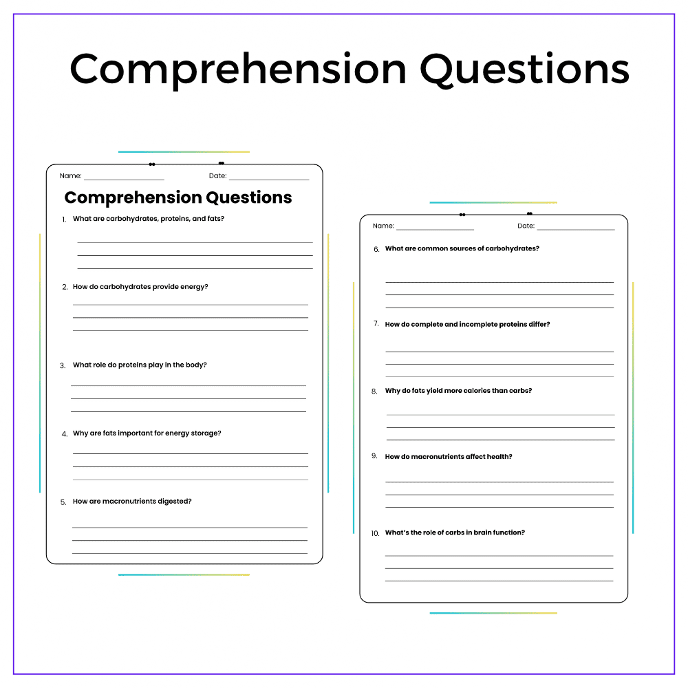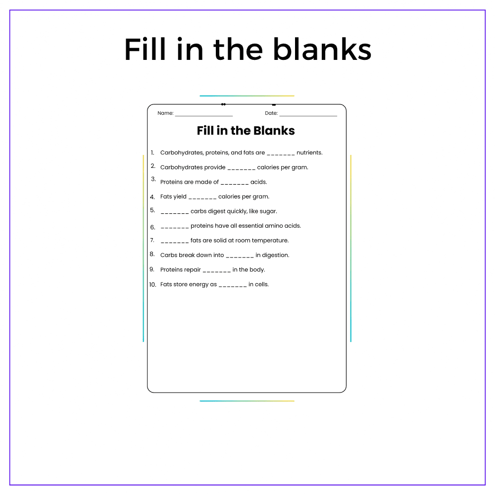 - Fill-in-the-blanks – Reinforce terms like “amino acids,” “glucose,” and “lipids”