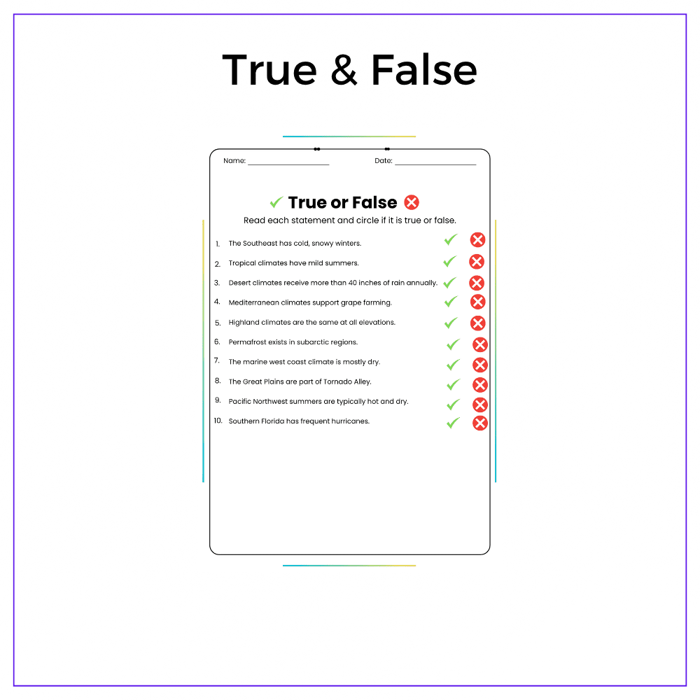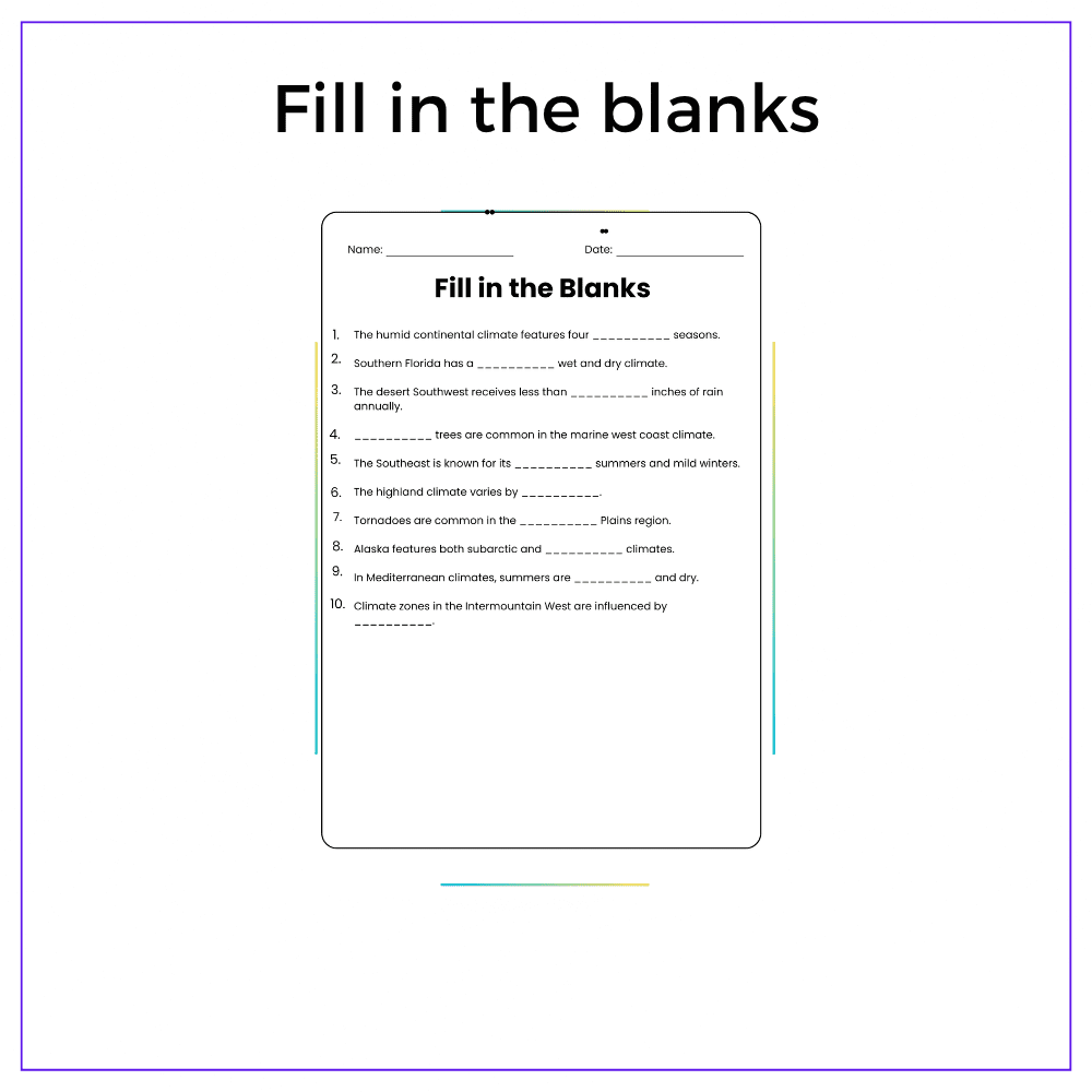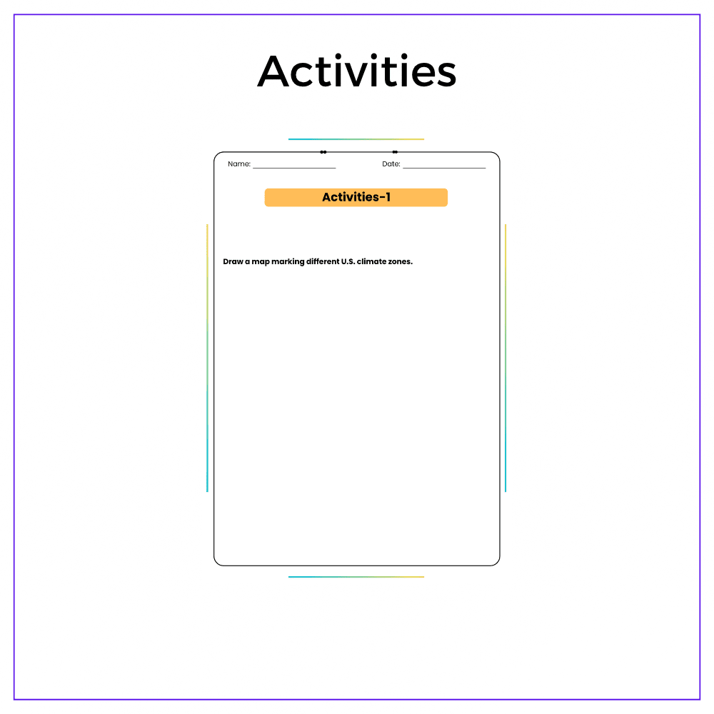 This worksheet helps your students understand weather patterns with this interactive Climate Zones of the USA worksheet! Designed for grades 4–8, this resource covers the country’s diverse climate regions—from humid subtropical in the Southeast to arid deserts in the Southwest.