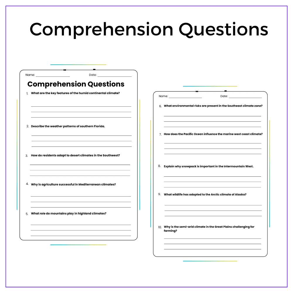 This versatile worksheet is perfect for individual assignments, group discussions, homeschooling, or extra practice, ensuring students understand how location influences temperature, rainfall, and ecosystems. With a mix of engaging passages, fill-in-the-blanks, MCQs, and activities, it’s a must-have climate learning tool.