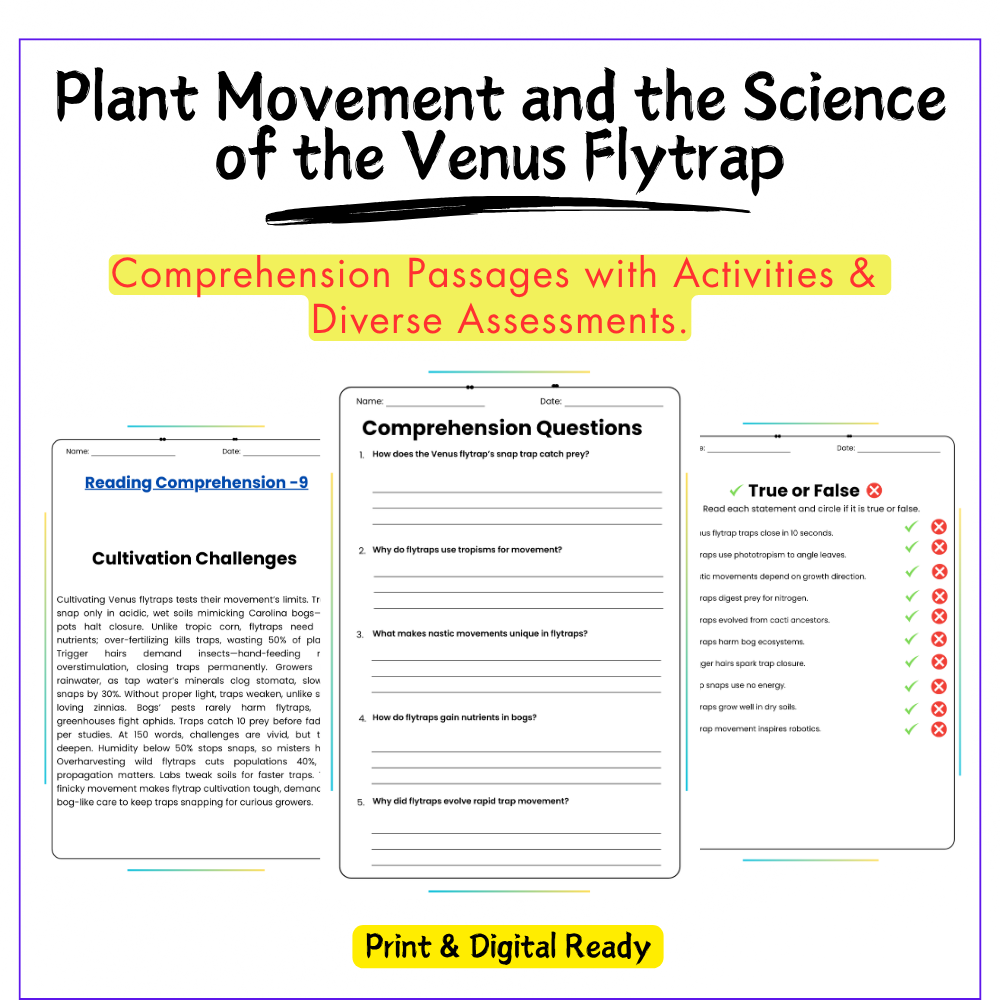 This worksheet helps your students explore the wonders of plant movement with this interactive Plant Movement and the Science of the Venus Flytrap worksheet! Designed for grades 4–8, this resource reveals how certain plants, like the Venus flytrap, move in response to stimuli and capture their prey.