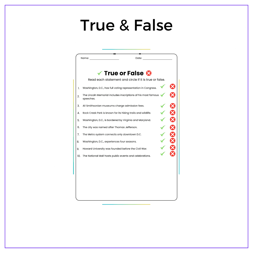 This worksheet helps your students explore the nation’s capital with this interactive Discovering Washington, D.C. worksheet! Designed for grades 4–8, this resource introduces key landmarks like the White House, U.S. Capitol, and Lincoln Memorial, and explains the importance of D.C. in American government and history.