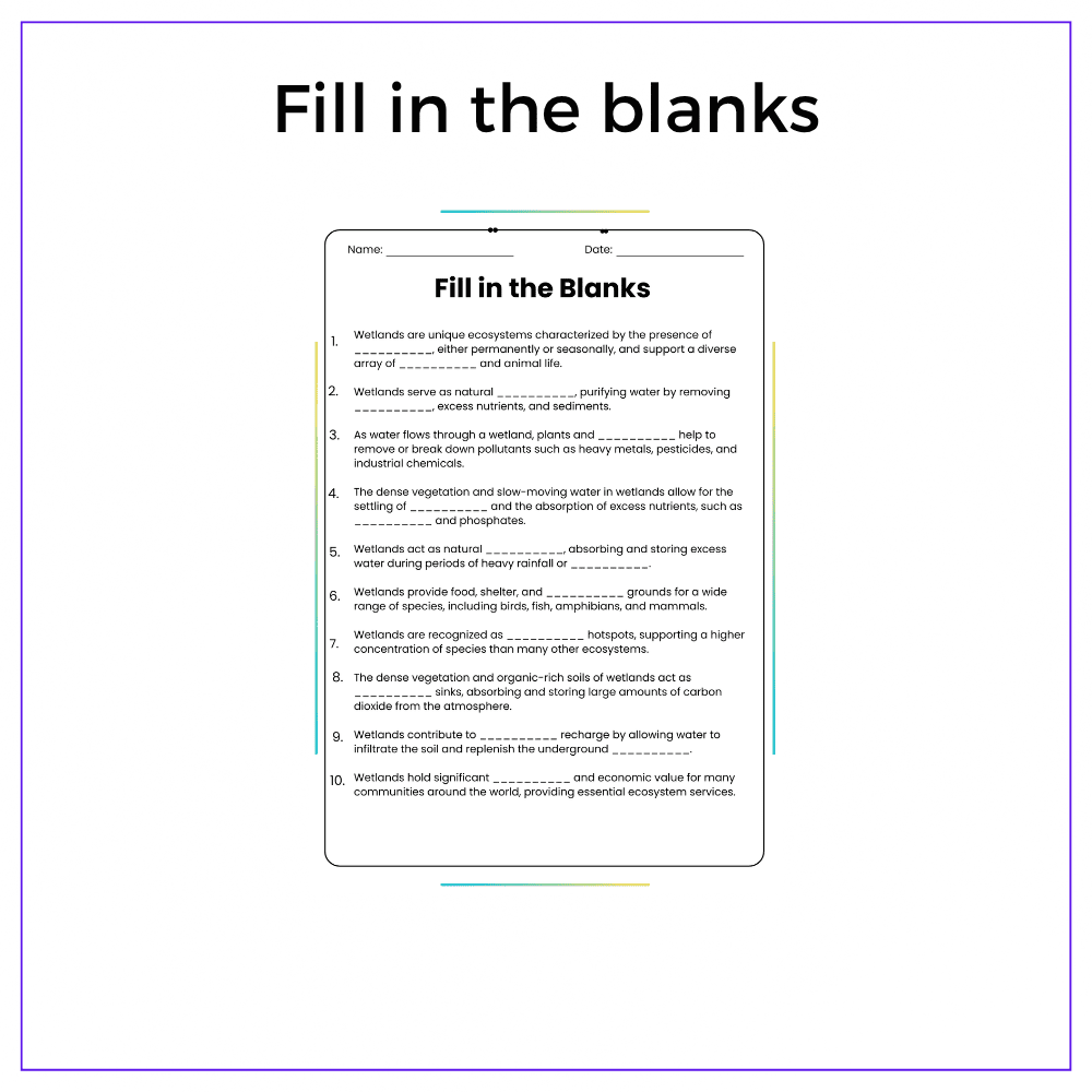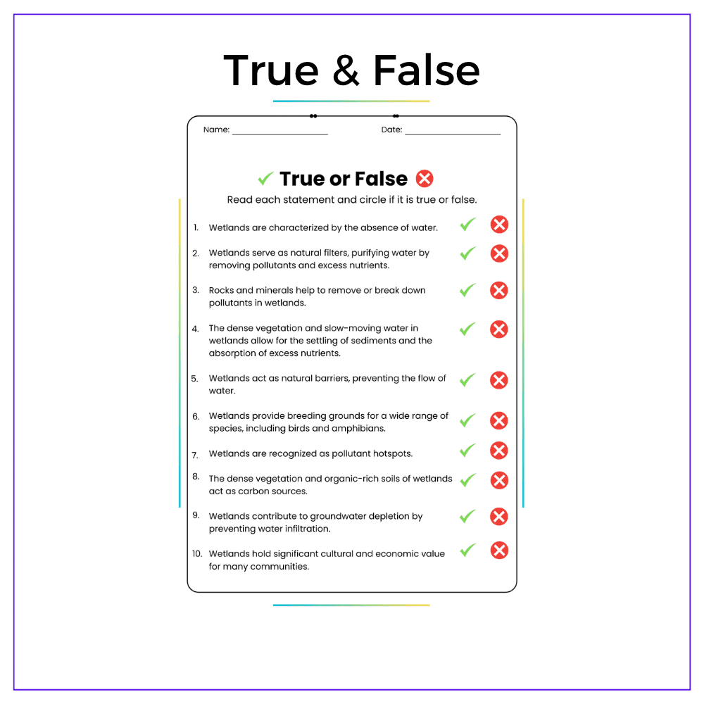 This worksheet helps your students understand the vital functions of wetlands with this interactive Wetlands as Natural Filters and Wildlife Habitats resource! Designed for grades 4–8, this resource explores how wetlands clean water, reduce flooding, and provide homes for diverse species through fun and educational activities.