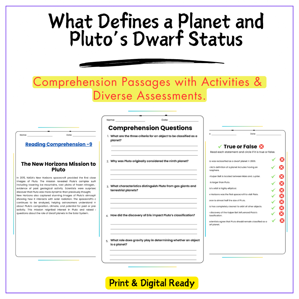 Help your students decode the mystery behind what makes a planet with this What Defines a Planet and Pluto’s Dwarf Status worksheet! Perfect for grades 4–8, this resource explores the scientific criteria used to classify planets and why Pluto lost its full planet status. Complex astronomy concepts are broken down into fun, student-friendly content.