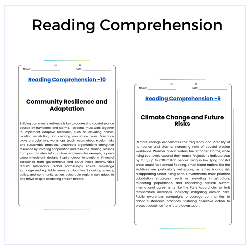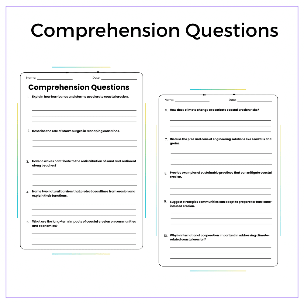 ✅ Comprehension passages – Explain causes of erosion, effects on coastlines, and prevention methods