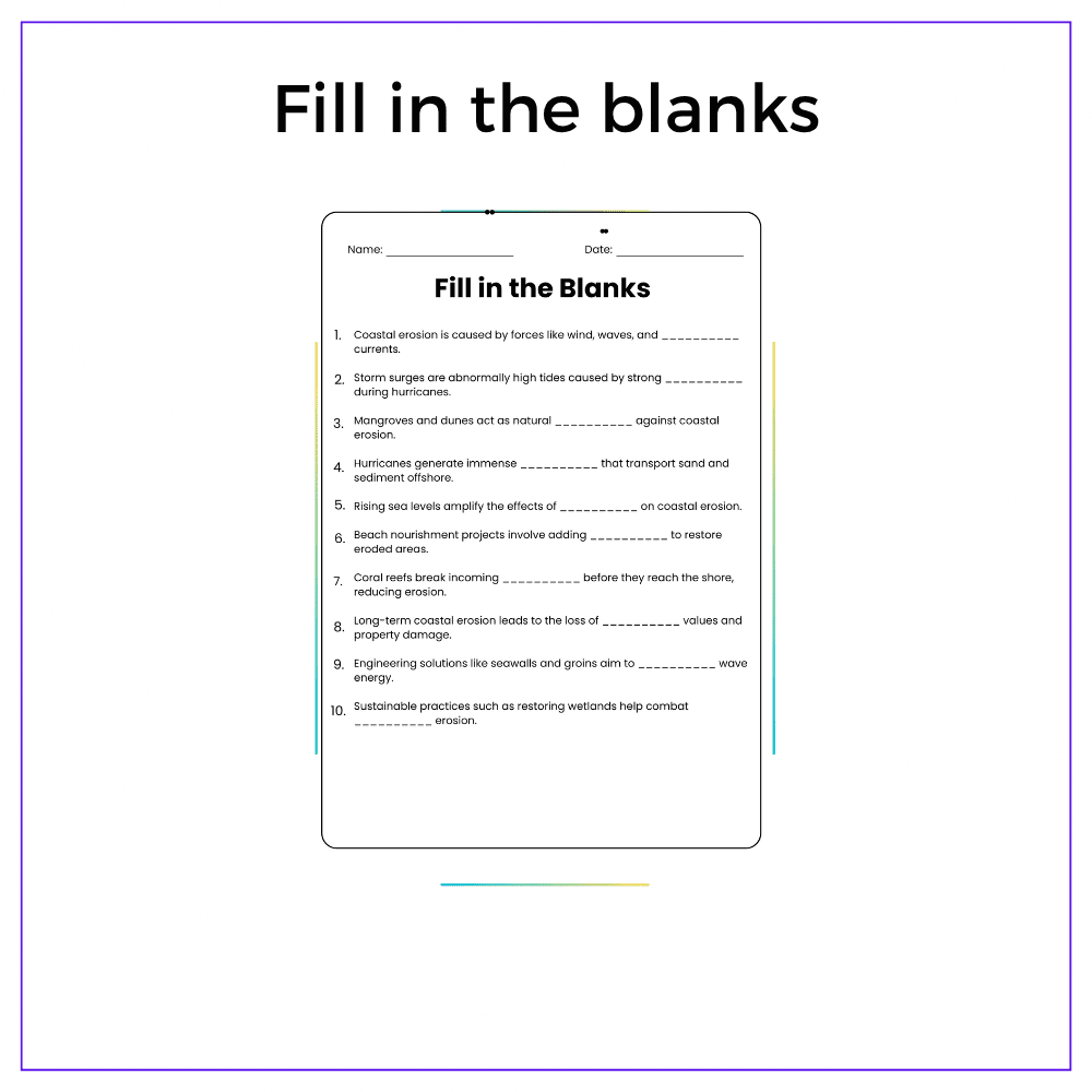 ✅ Fill-in-the-blanks – Reinforce key terms like deposition, tides, barrier islands, and seawalls