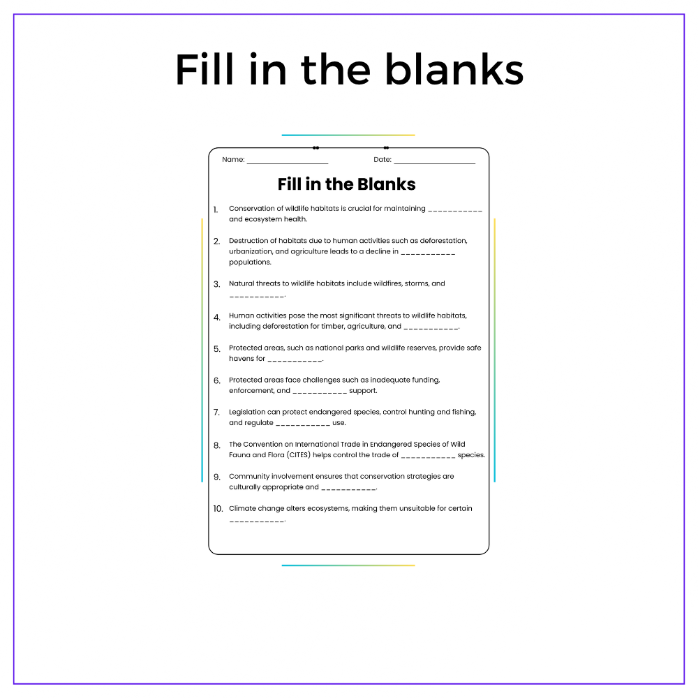 • Fill-in-the-blanks – Solidify key terms like “ecosystem” and “preservation”
