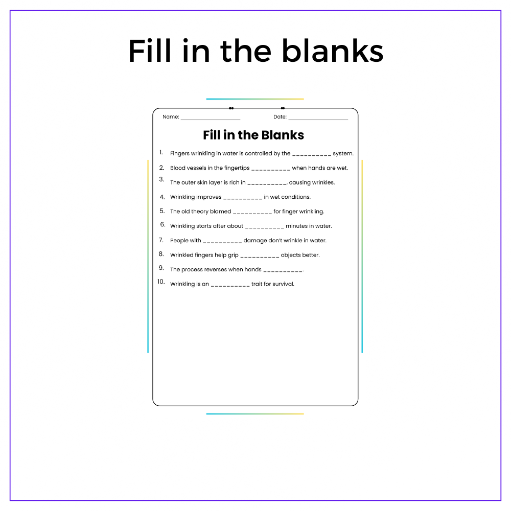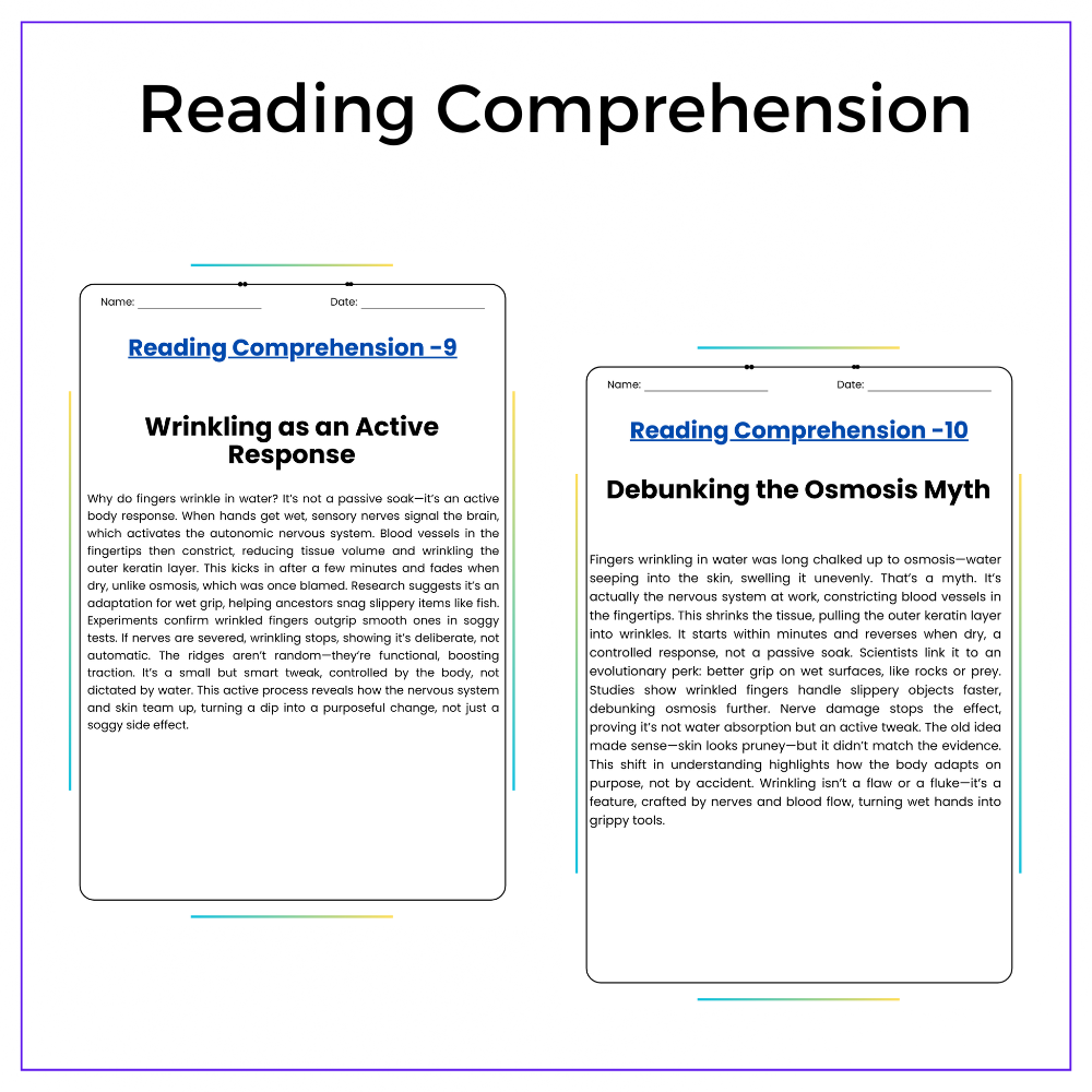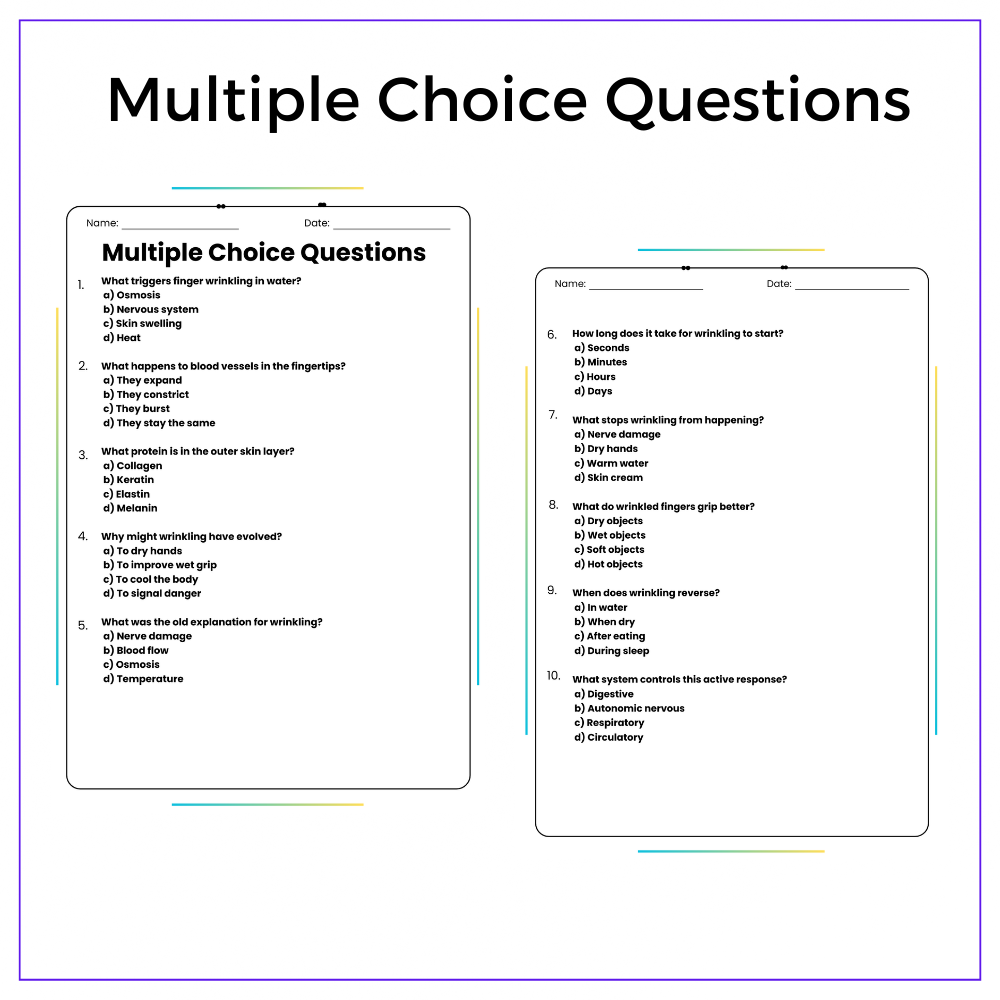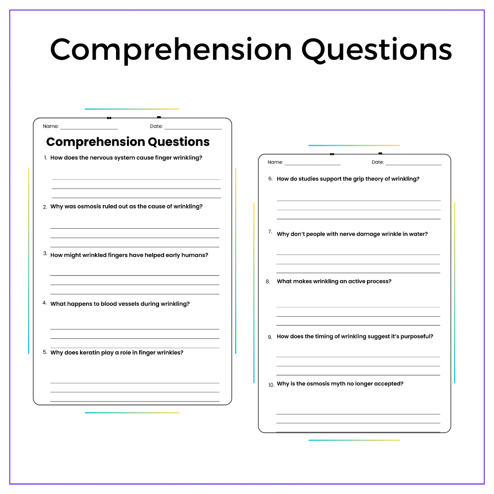 - Comprehension passages – Clear explanations of why fingers wrinkle in water